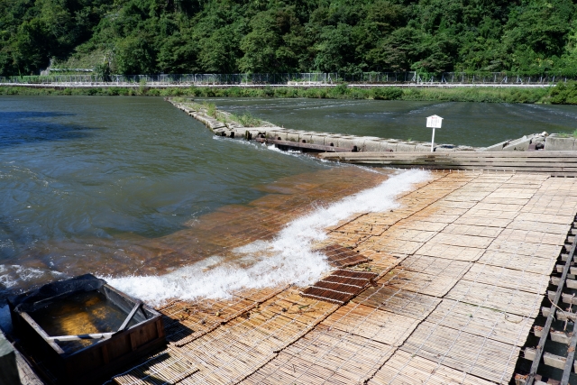 「やな」って聞いたことありますか?これは川を横断するように設置する伝統的な構造物で、遡上したり降下したりする魚の習性を利用して魚を捕獲する昔ながらの漁法なんです。