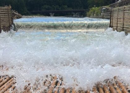 「やな」とは、川の流れを利用して魚をとる、日本の伝統的な漁の仕組みです。竹などで作ったスノコ状の台を川の流れの中に設置し、そこに流れてきた鮎を受け止める、とてもシンプルで自然に寄り添った漁法です。